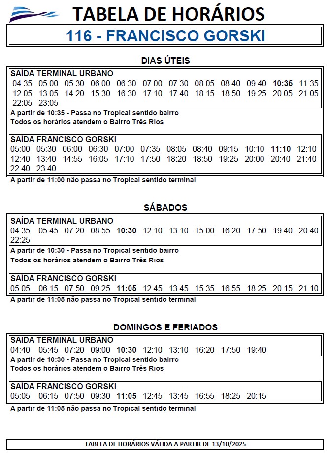 TODOS OS HORÁRIOS ATENDEM O BAIRRO TRÊS RIOS
