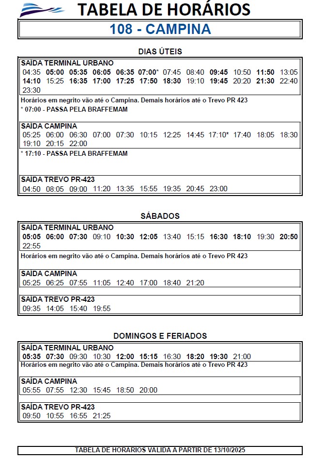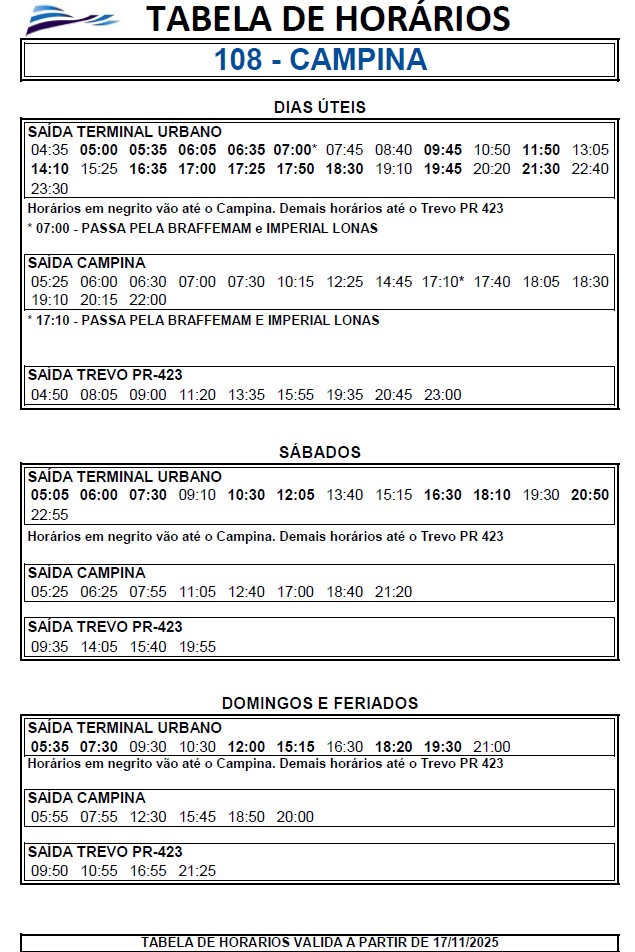 ** PONTO FINAL CAMPINA, DEMAIS HORARIOS: TREVO PR423