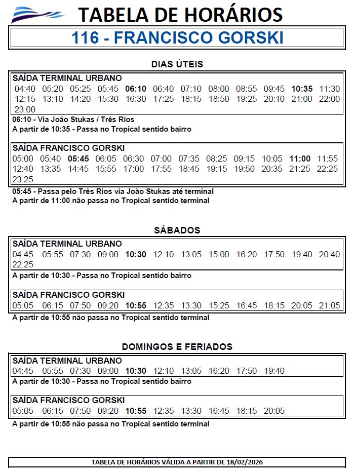 05:45 - PASSA PELO TRES RIOS VIA JOAO STUKAS ATÉ TERMINAL